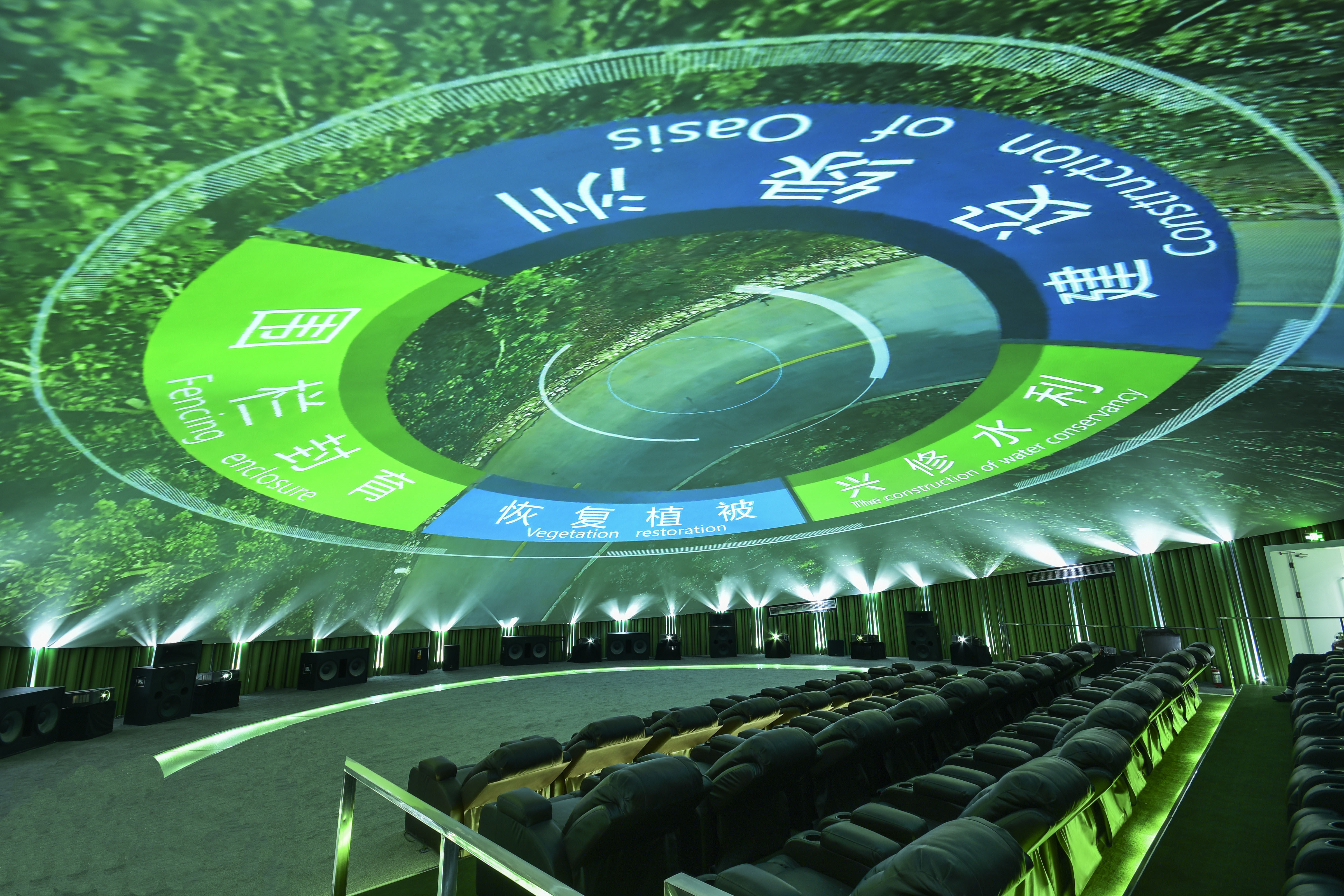 宁夏银川,中国-阿拉伯国家绿博园主题馆,其直径近30米的穹幕影院,是西部最大的穹幕影院。 该主题馆的多媒体展示项目,有穹幕影院、沙盘系统等,此次项目我们用投影方式打造了大型的穹顶球幕影院。