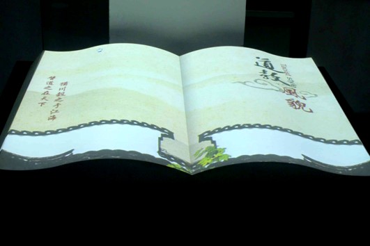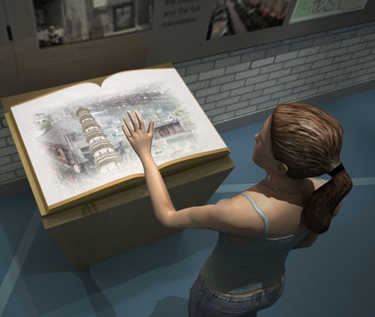 桌上放置一本翻开的虚拟图书,当观众做出翻书动作时,虚拟图书即可自然翻页,并伴有现实阅读过程中纸张翻动的声音, 让观众对电子翻书的内容产生兴趣。